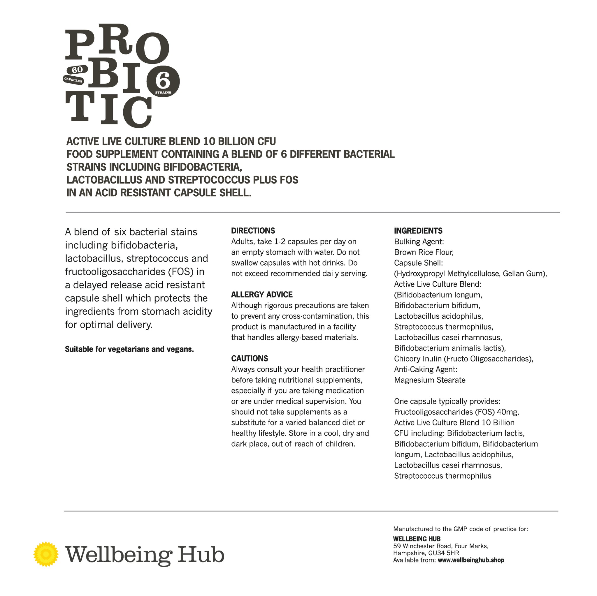 A probiotic blend containing 6 bacteria strains to support gut health in a delayed release acid resistant capsule shell to protect the ingredients from stomach acidity enabling optimal delivery. Each capsule contains an active live culture blend of 10 billion CFU with Fructooligosaccharides (FOS).